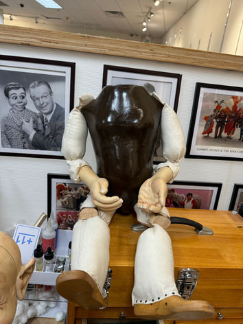 The McElroy brothers were famous for their use of "direct linkage", which replaces the commonly used string and pully system for vent figures, with a much more complicated series of metal components that work together to operate the animations. There are no strings inside Cecil, all of his movements are done with intricate custom metal pieces. The brothers used steel, and would braze the parts together with an acetylene torch. Today, figure makers prefer brass for its ease of bending, cutting, and soldering. Another trademark of the McElroy brothers was to use weights for the "all direction eyes" and the eyebrows. So instead of having to mess with operating the eyes and eyebrows, the simple move in the direction in which the head is turned. If you want the dummy to look left, you turn his head left, and vice versa. The eyebrows are a little more difficult to control and are often just bouncing all over the place, which is something I love about their work.